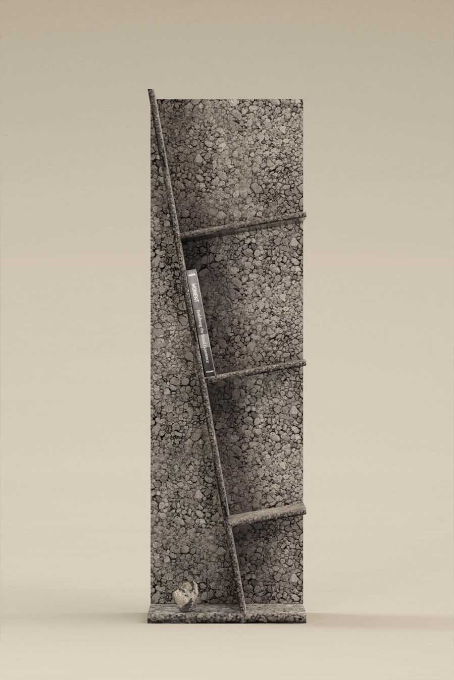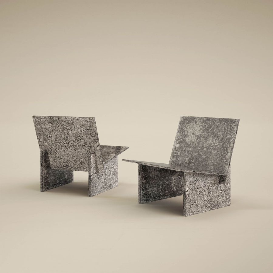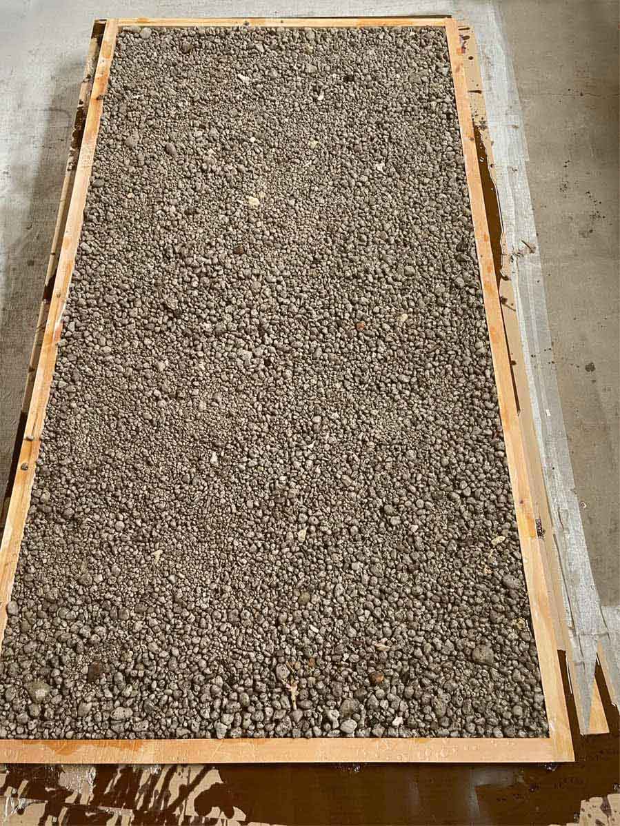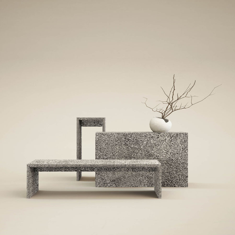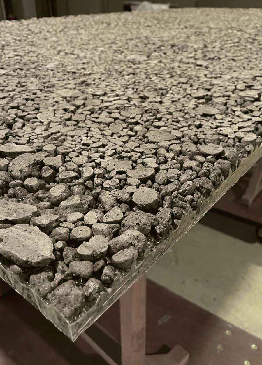2021年8月、海底火山の噴火で、沖縄の海に大量の軽石が漂着した。魚やサンゴは傷つき、漁業は大きな打撃を受け、観光や島民の暮らしにも影響が広がった。自治体やボランティアが回収した軽石は使い道も無く、各地に積まれたまま放置された。そんな軽石を回収し、硬化と研磨を重ねて板材に加工。家具や店舗デザインの一部として取り入れ、もう一度素材としての命を吹き込む。不要とされたものにあらためて意味を持たせる。それもデザインの役割のひとつだと考えている。