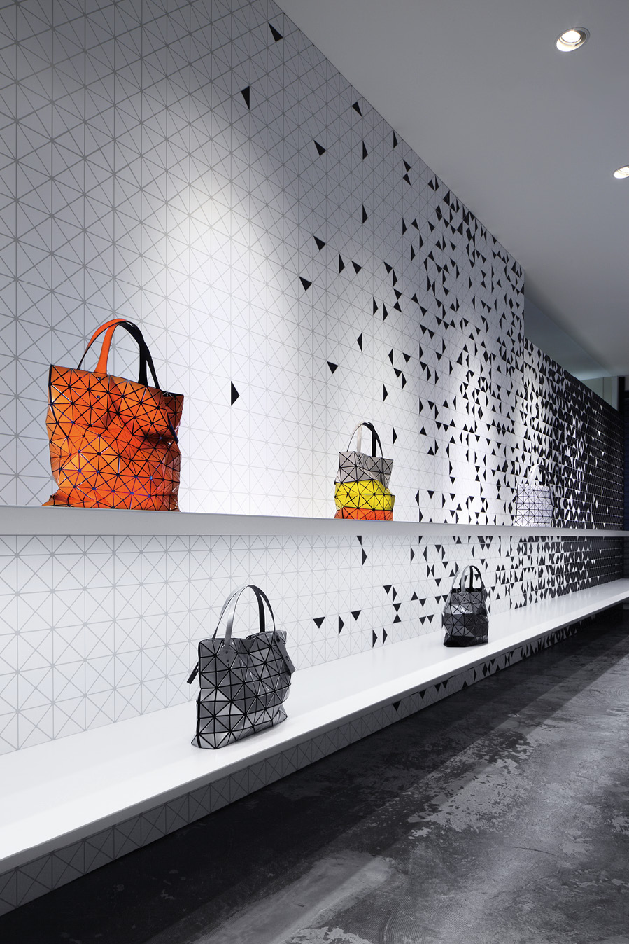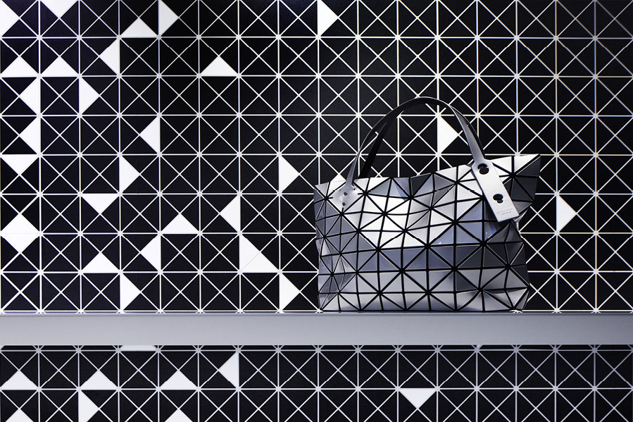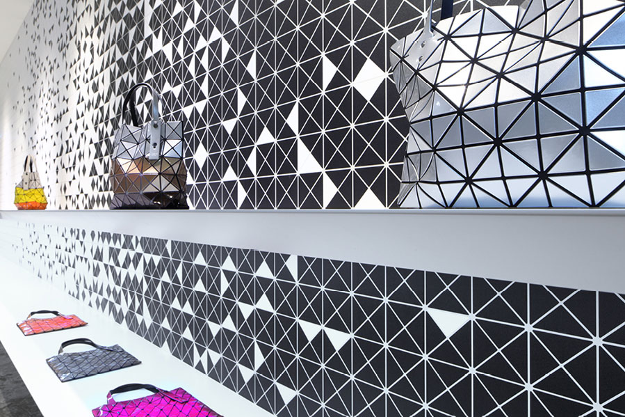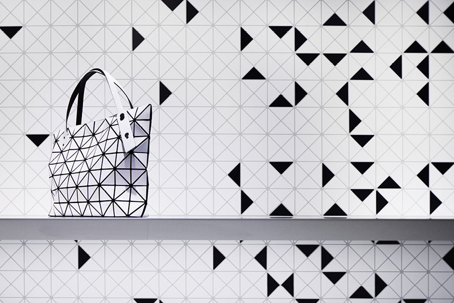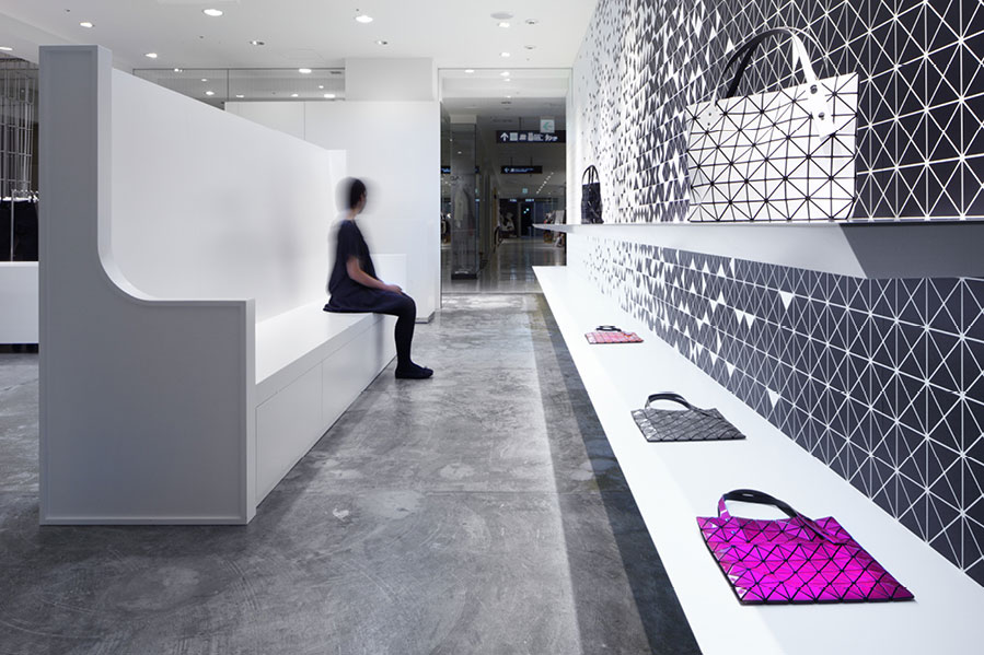 与えられた敷地は、店舗と店舗の隙間にある一本の小道。売場からエスカレーターへの“近道”として使われており、通行量も多いと聞いた。この、ややネガティブともとれる特異な立地をポジティブに解釈した。「お客を誘い込むための過剰な演出は不要であり、むしろ必要なのは、通りすがりの人が思わず足を止めたくなるような“仕掛け”である」と。通り抜けられる気軽さを残しつつ、小道に面した長い壁には、BAO BAO ISSEY MIYAKEの象徴である三角ピースを用いた大胆なグラフィックパターンと長い棚をしつらえた。パターンは入口から出口にかけて白から黒へとグラデーションを描き、空間にリズムと奥行きをもたらしている。白と黒が交錯する二面的な背景は、同じ商品であっても置かれる位置によって印象を変え、一方向の動線に生まれがちな単調さを和らげる。反対側の壁には、空間を緩やかに区切る大きなベンチを設置。何気なく通り過ぎる人が空間の変化に気づき、立ち止まり、自然と滞在する時間が生まれるような構成とした。通路を店舗に、通過を買い物体験へと、シームレスにつながる空間に仕立てた。