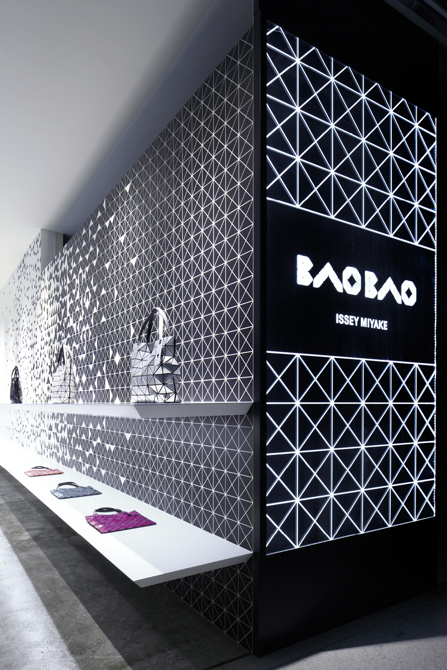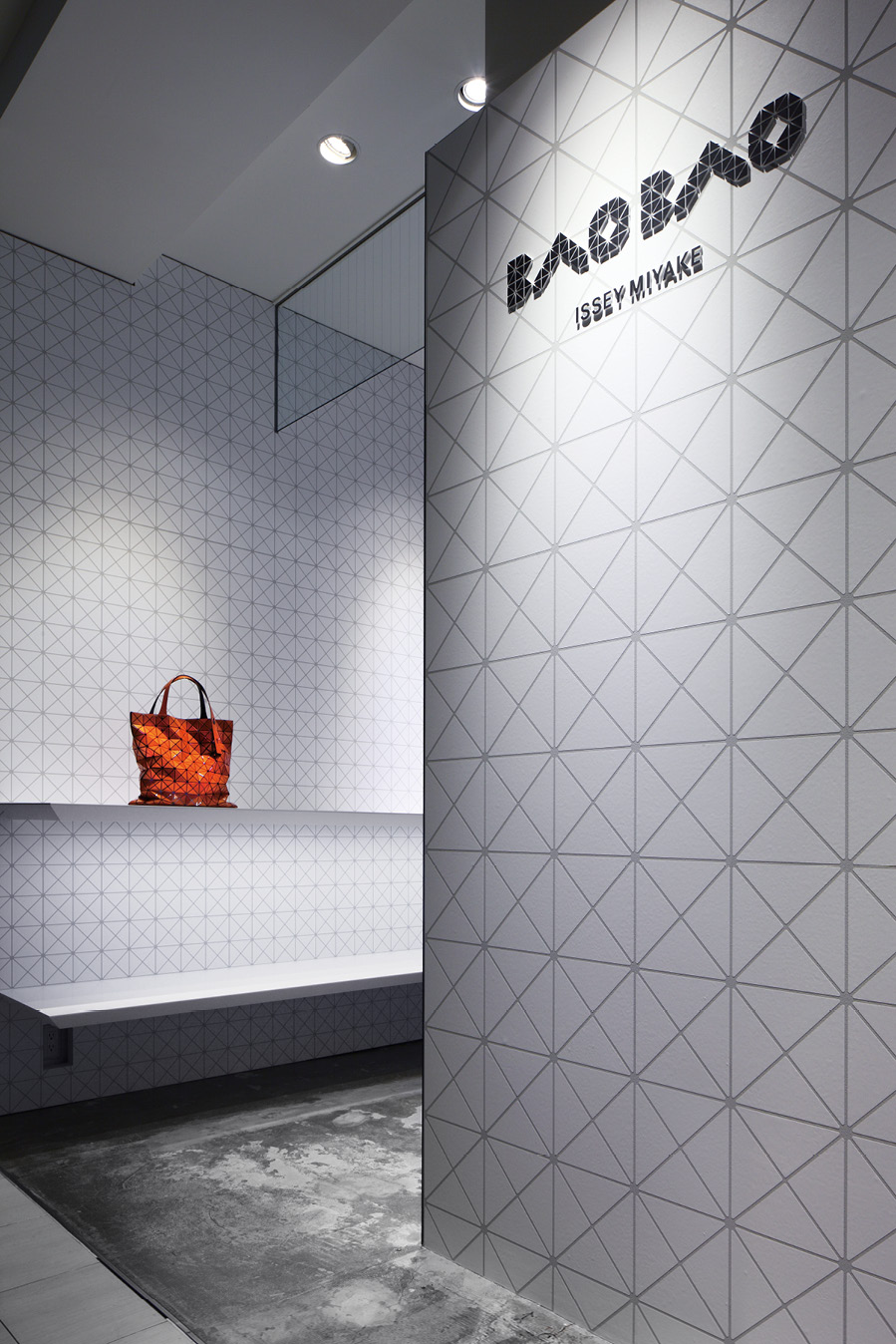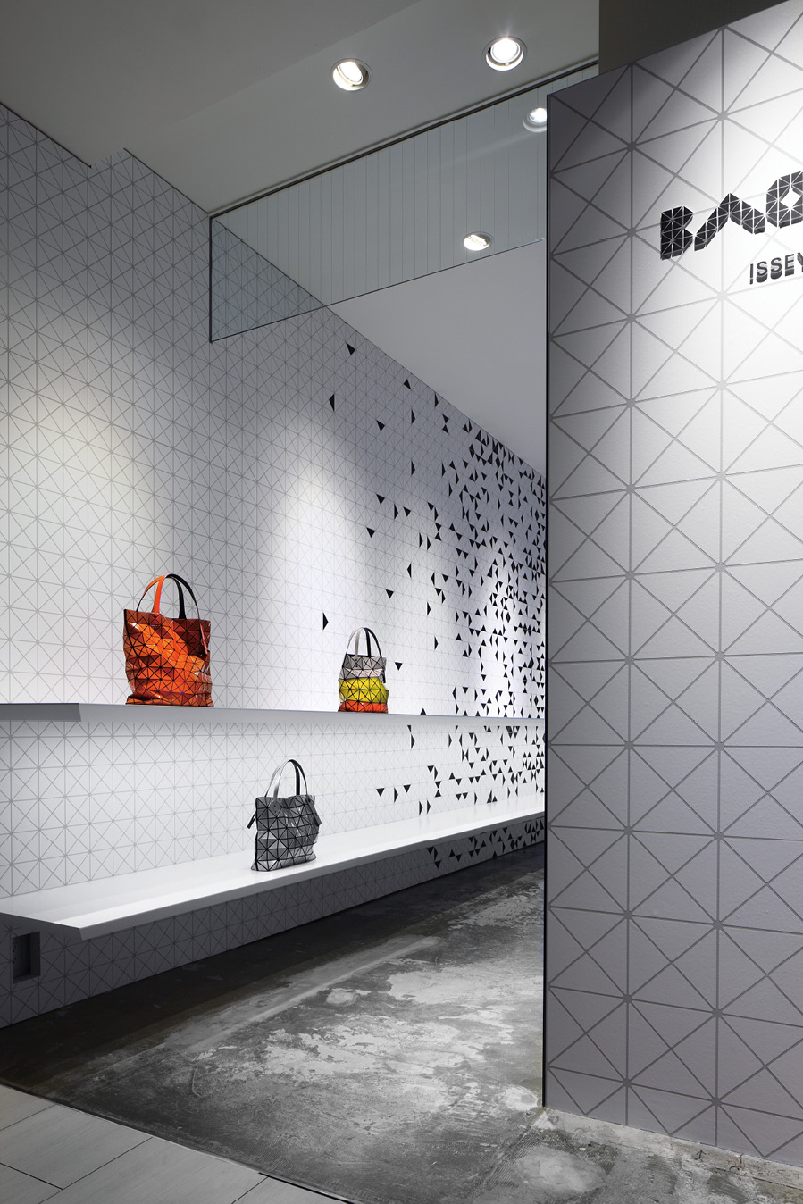 与えられた敷地は、店舗と店舗の隙間にある一本の小道。売場からエスカレーターへの“近道”として使われており、通行量も多いと聞いた。この、ややネガティブともとれる特異な立地をポジティブに解釈した。「お客を誘い込むための過剰な演出は不要であり、むしろ必要なのは、通りすがりの人が思わず足を止めたくなるような“仕掛け”である」と。通り抜けられる気軽さを残しつつ、小道に面した長い壁には、BAO BAO ISSEY MIYAKEの象徴である三角ピースを用いた大胆なグラフィックパターンと長い棚をしつらえた。パターンは入口から出口にかけて白から黒へとグラデーションを描き、空間にリズムと奥行きをもたらしている。白と黒が交錯する二面的な背景は、同じ商品であっても置かれる位置によって印象を変え、一方向の動線に生まれがちな単調さを和らげる。反対側の壁には、空間を緩やかに区切る大きなベンチを設置。何気なく通り過ぎる人が空間の変化に気づき、立ち止まり、自然と滞在する時間が生まれるような構成とした。通路を店舗に、通過を買い物体験へと、シームレスにつながる空間に仕立てた。