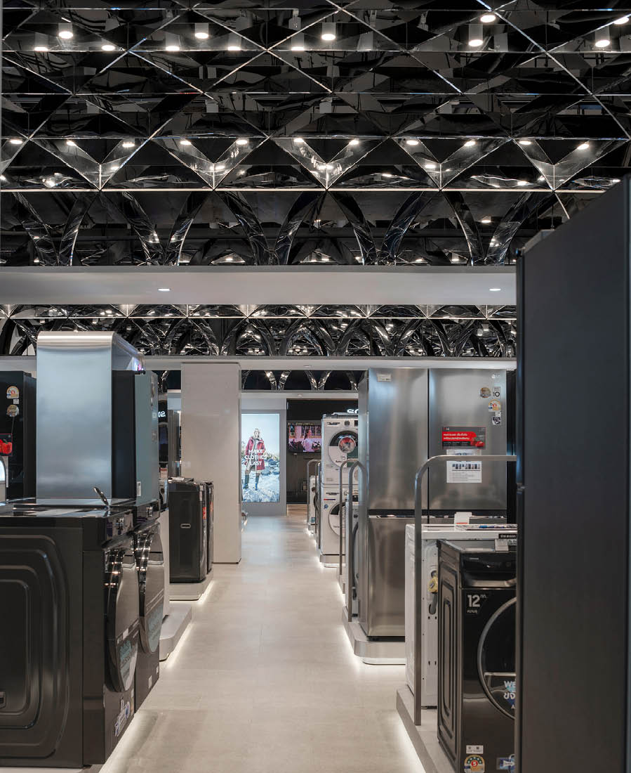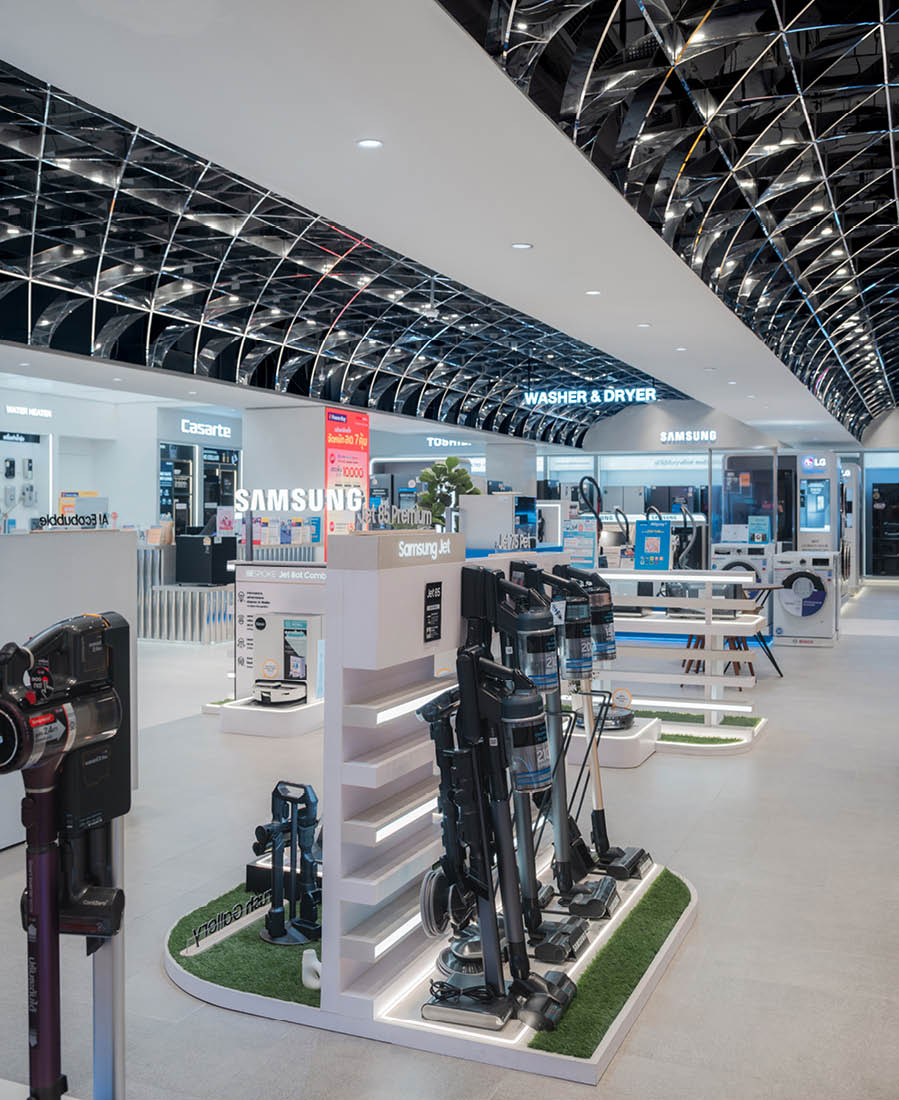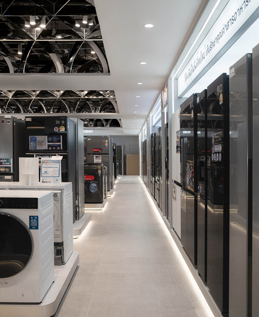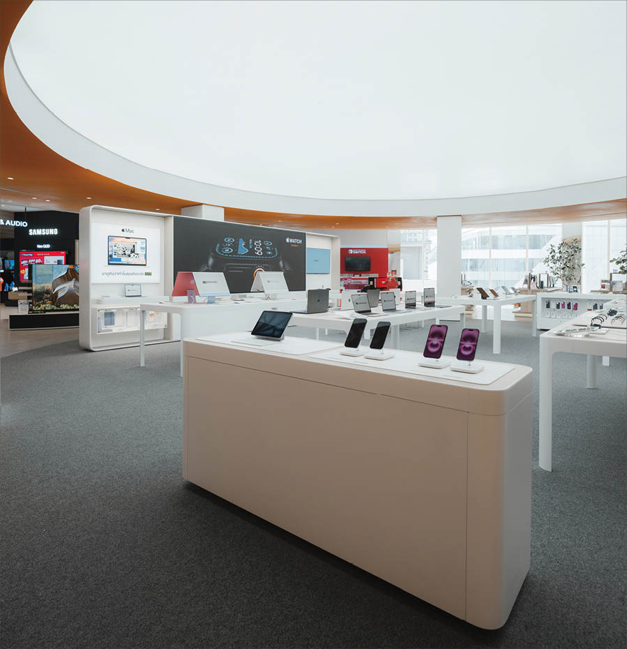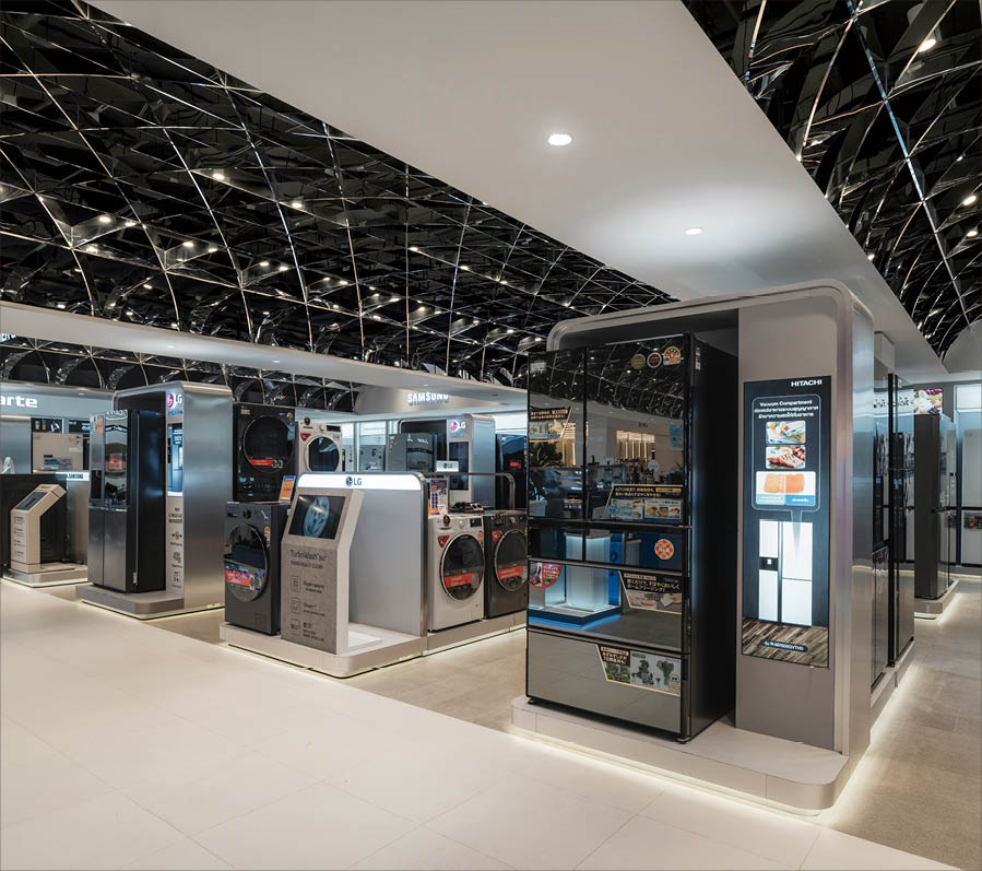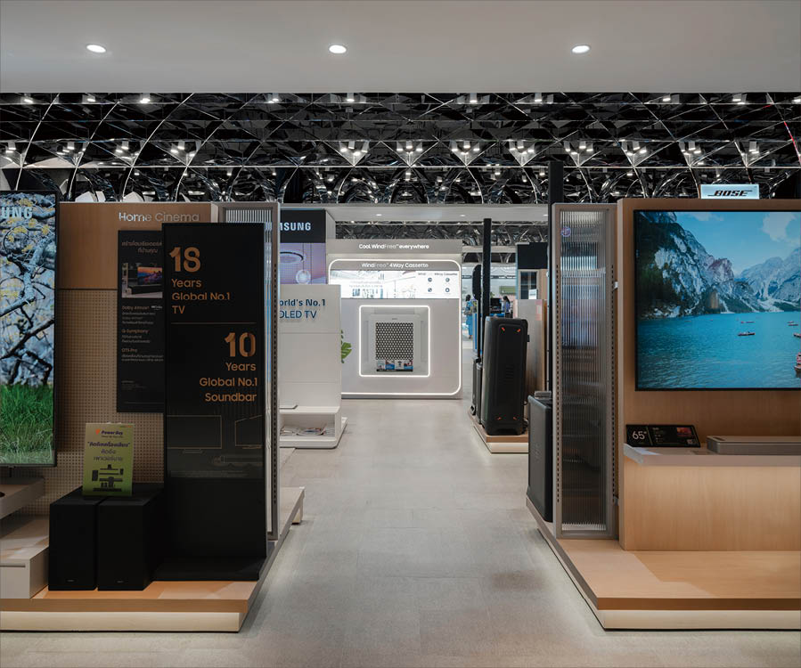 POWER BUYは、800ブランド・2万点を超える製品を扱うタイで有名な家電量販店である。ここでは、多様な製品群を直感的に体験できる設計を行なった。空間は、Apple製品を中心とした小型家電、冷蔵庫や洗濯機などの白物家電、テレビを中心とした黒物家電の3つのゾーンに大別され、それぞれのプロダクト特性に呼応するデザインとなっている。小型家電のゾーンは、建築のフォルムに沿って円形にレイアウトされており、その中心にApple製品を集約し、周囲にはスピーカーやヘッドフォンなどの関連プロダクトを放射状に展開することで、製品同士の連動性や拡張性が直感的に読み取れる空間構成としている。白物家電のゾーンでは、製品がもつ清潔さや機能性を空間そのもので体現するため、白を基調としたフラットな光、製品メカニズムを想起させる金属の大胆なフォルムによって商品群を包み込み、製品の効果や存在感を空間的に増幅させる構成としている。黒物家電のゾーンは、テレビや映像機器がもつ没入感を最大限に引き出すため、空間全体をブラックアウトし、映像だけが浮かび上がる環境を構築している。木天井は、商品が置かれる場を静かに示唆しながら、沈静した空間の中に柔らかな気配をつくり出している。各ゾーンは明確なコンセプトを持ちつつも、動線や素材の連続性によって緩やかに接続されており、来店者は意識することなくプロダクトの世界を横断しながら、生活とテクノロジーが交差する場を体験していく。