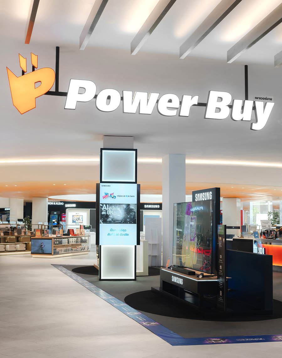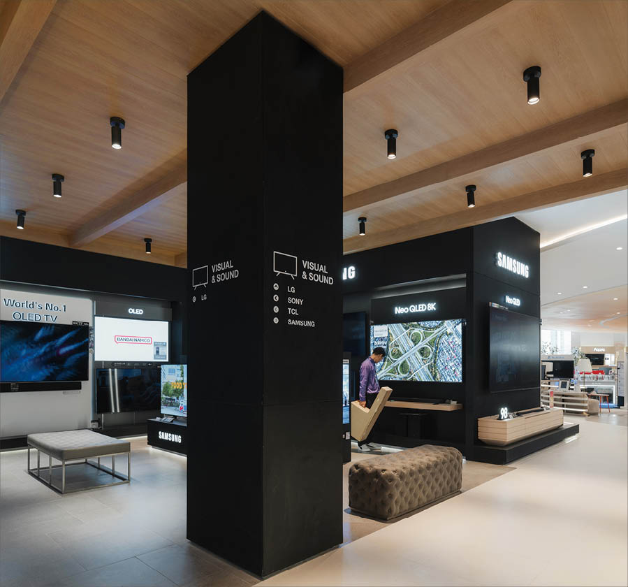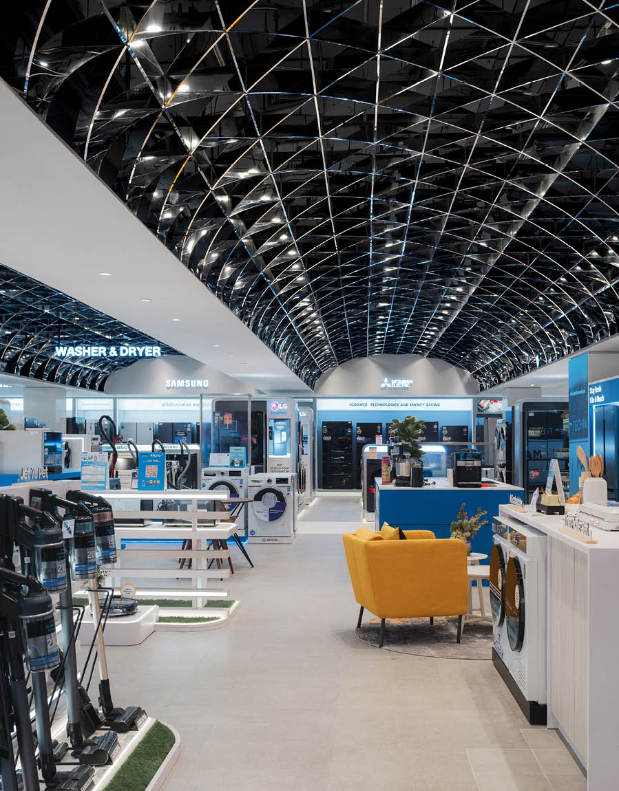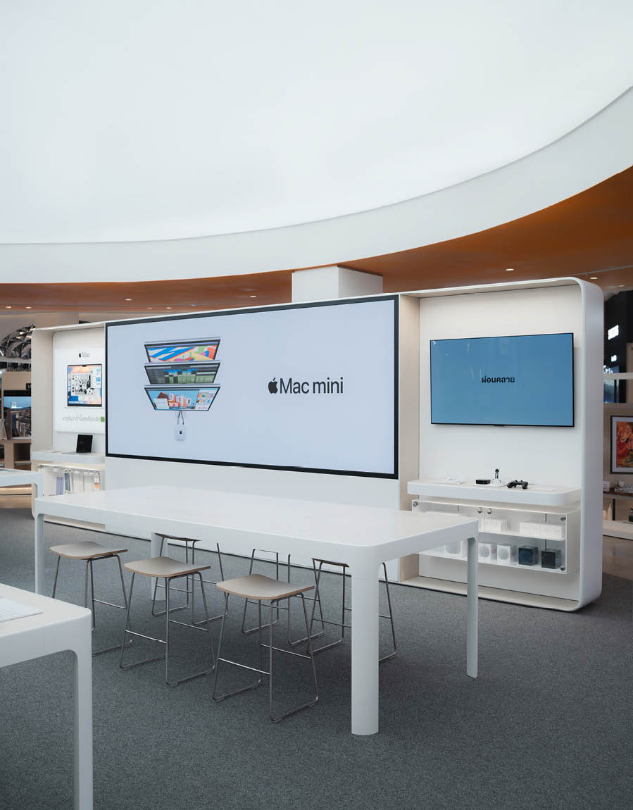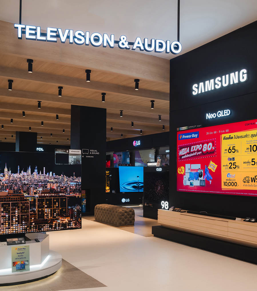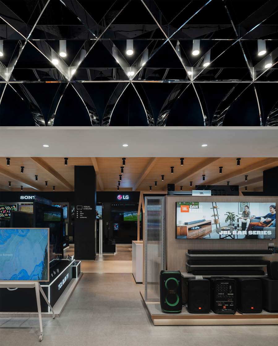 POWER BUYは、800ブランド・2万点を超える製品を扱うタイで有名な家電量販店である。ここでは、多様な製品群を直感的に体験できる設計を行なった。空間は、Apple製品を中心とした小型家電、冷蔵庫や洗濯機などの白物家電、テレビを中心とした黒物家電の3つのゾーンに大別され、それぞれのプロダクト特性に呼応するデザインとなっている。小型家電のゾーンは、建築のフォルムに沿って円形にレイアウトされており、その中心にApple製品を集約し、周囲にはスピーカーやヘッドフォンなどの関連プロダクトを放射状に展開することで、製品同士の連動性や拡張性が直感的に読み取れる空間構成としている。白物家電のゾーンでは、製品がもつ清潔さや機能性を空間そのもので体現するため、白を基調としたフラットな光、製品メカニズムを想起させる金属の大胆なフォルムによって商品群を包み込み、製品の効果や存在感を空間的に増幅させる構成としている。黒物家電のゾーンは、テレビや映像機器がもつ没入感を最大限に引き出すため、空間全体をブラックアウトし、映像だけが浮かび上がる環境を構築している。木天井は、商品が置かれる場を静かに示唆しながら、沈静した空間の中に柔らかな気配をつくり出している。各ゾーンは明確なコンセプトを持ちつつも、動線や素材の連続性によって緩やかに接続されており、来店者は意識することなくプロダクトの世界を横断しながら、生活とテクノロジーが交差する場を体験していく。