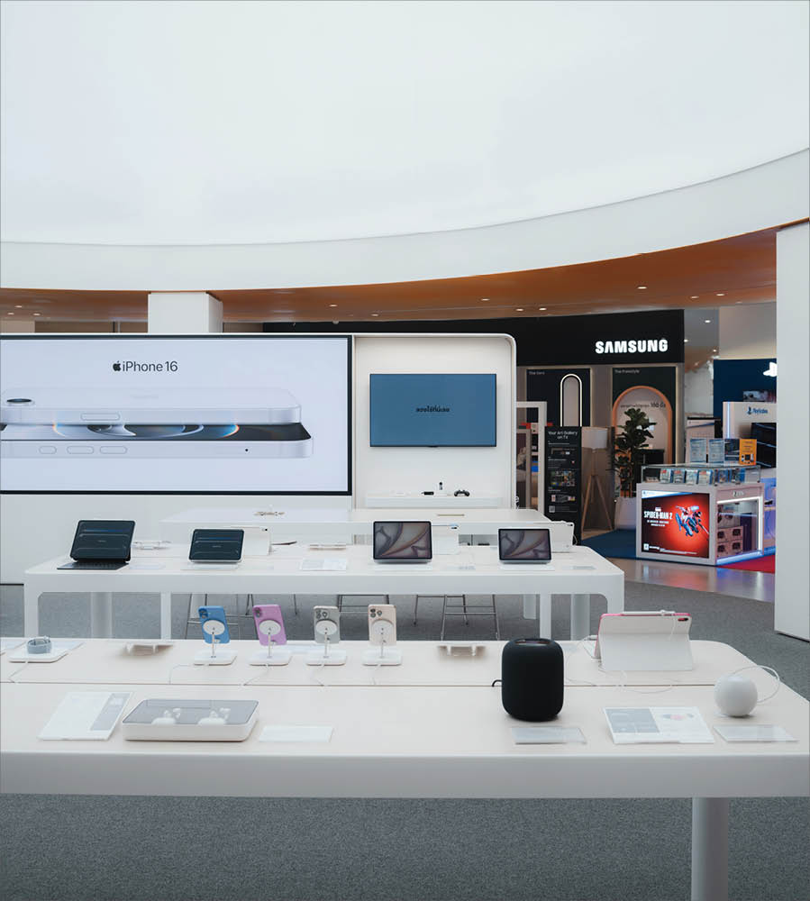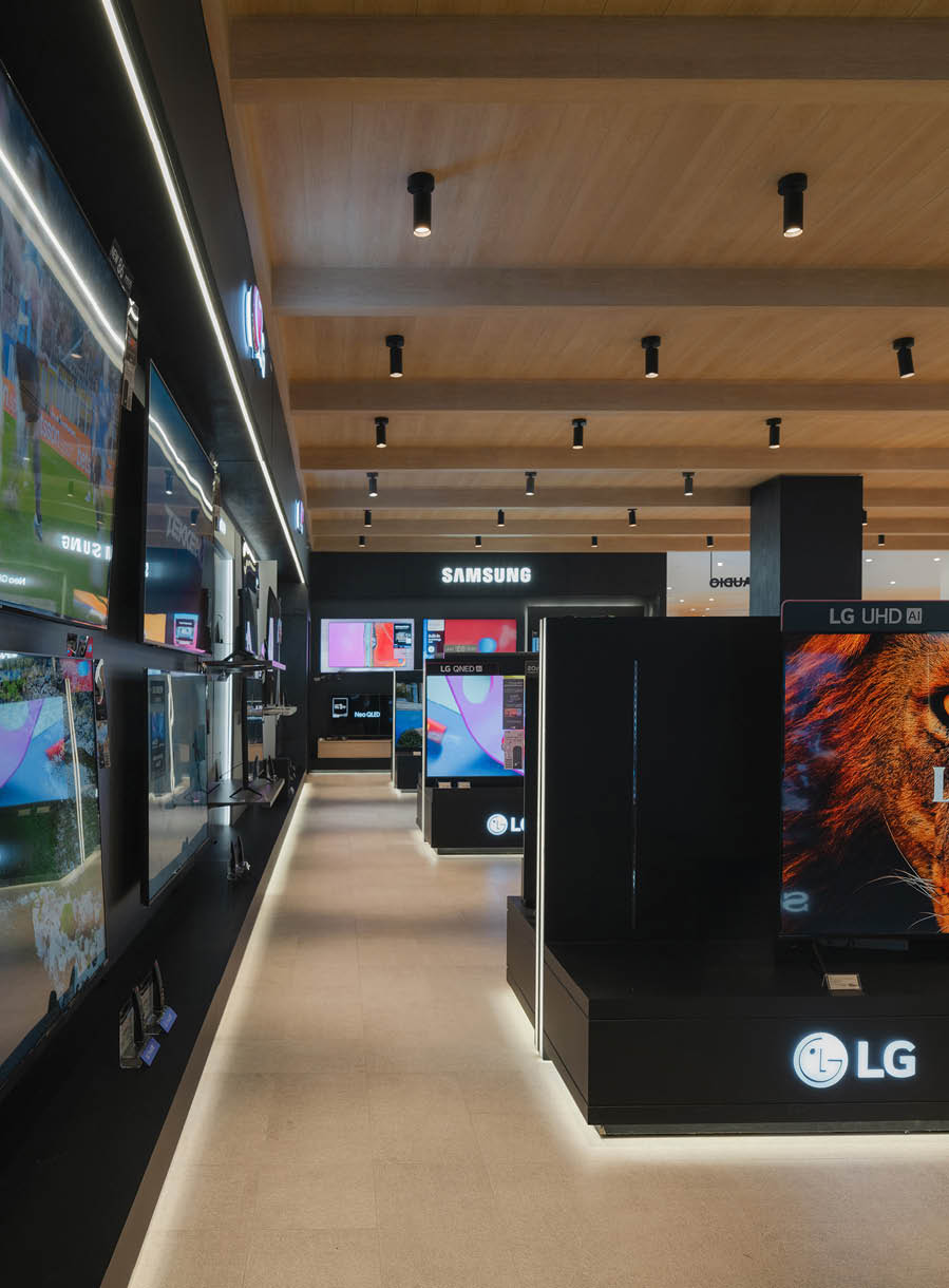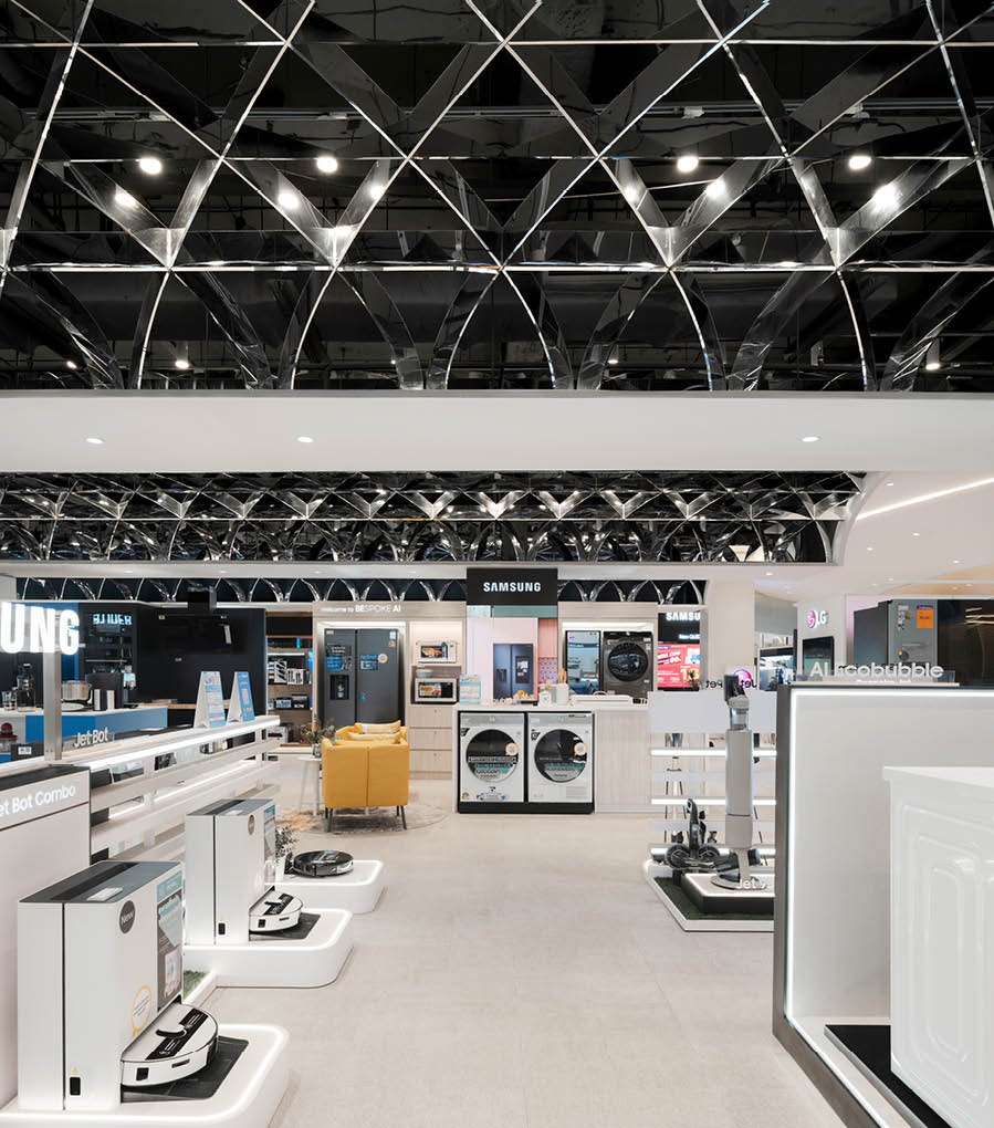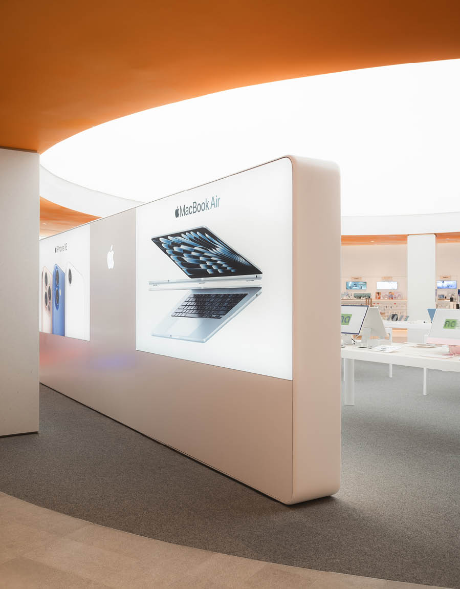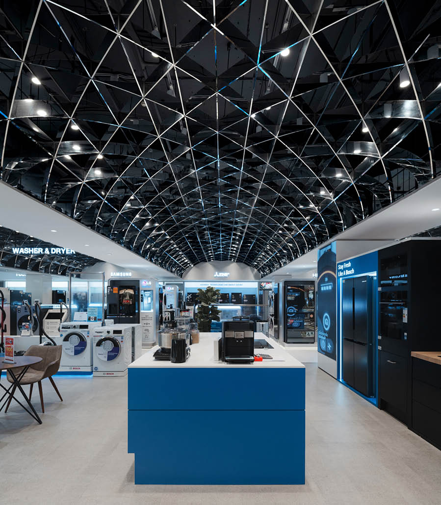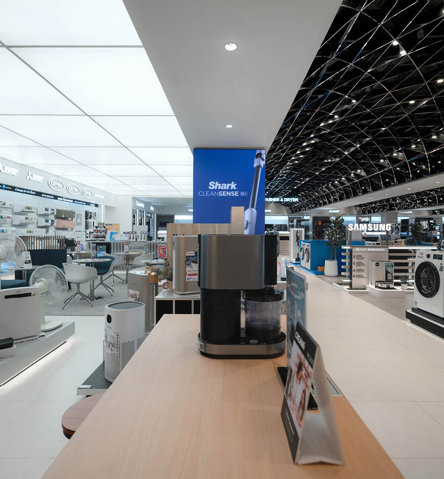 POWER BUYは、800ブランド・2万点を超える製品を扱うタイで有名な家電量販店である。ここでは、多様な製品群を直感的に体験できる設計を行なった。空間は、Apple製品を中心とした小型家電、冷蔵庫や洗濯機などの白物家電、テレビを中心とした黒物家電の3つのゾーンに大別され、それぞれのプロダクト特性に呼応するデザインとなっている。小型家電のゾーンは、建築のフォルムに沿って円形にレイアウトされており、その中心にApple製品を集約し、周囲にはスピーカーやヘッドフォンなどの関連プロダクトを放射状に展開することで、製品同士の連動性や拡張性が直感的に読み取れる空間構成としている。白物家電のゾーンでは、製品がもつ清潔さや機能性を空間そのもので体現するため、白を基調としたフラットな光、製品メカニズムを想起させる金属の大胆なフォルムによって商品群を包み込み、製品の効果や存在感を空間的に増幅させる構成としている。黒物家電のゾーンは、テレビや映像機器がもつ没入感を最大限に引き出すため、空間全体をブラックアウトし、映像だけが浮かび上がる環境を構築している。木天井は、商品が置かれる場を静かに示唆しながら、沈静した空間の中に柔らかな気配をつくり出している。各ゾーンは明確なコンセプトを持ちつつも、動線や素材の連続性によって緩やかに接続されており、来店者は意識することなくプロダクトの世界を横断しながら、生活とテクノロジーが交差する場を体験していく。