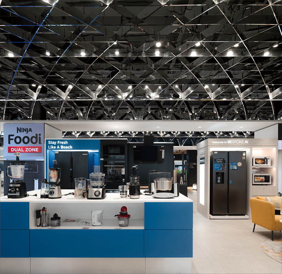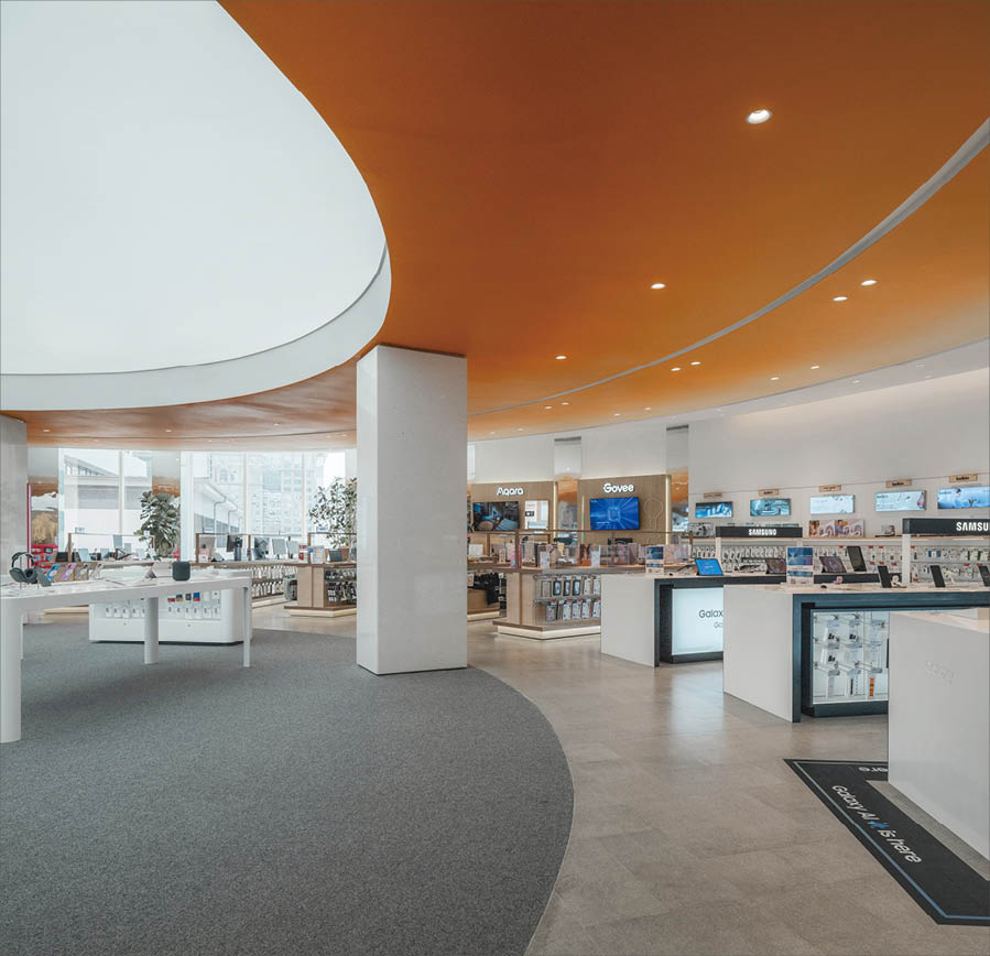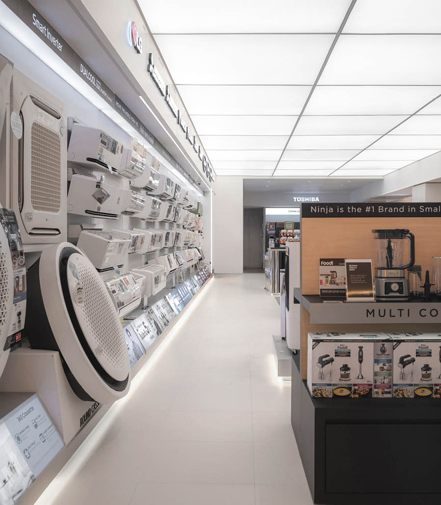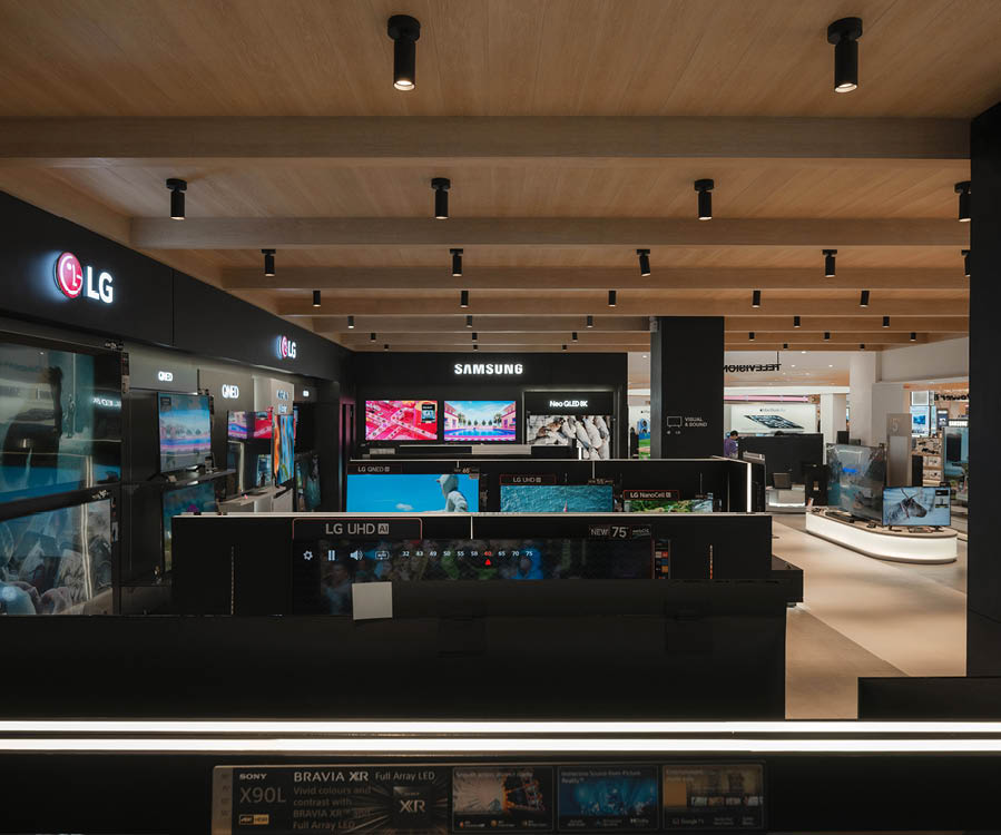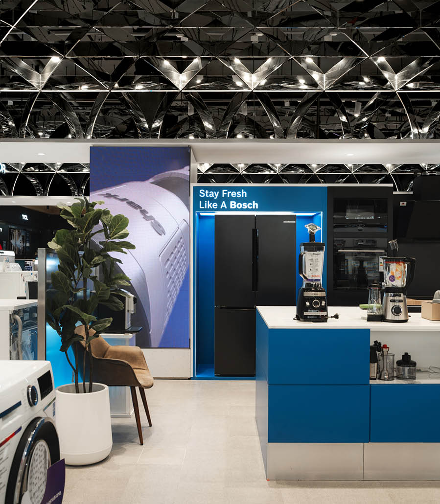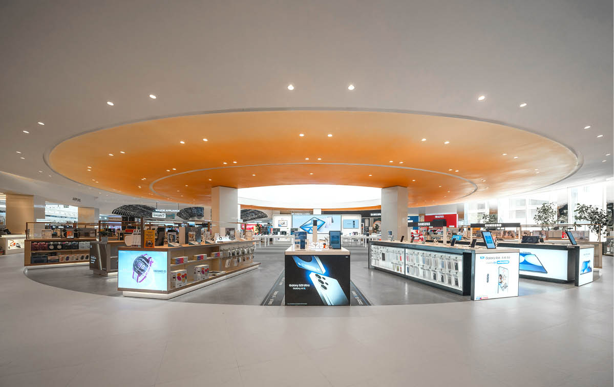 POWER BUYは、800ブランド・2万点を超える製品を扱うタイで有名な家電量販店である。ここでは、多様な製品群を直感的に体験できる設計を行なった。空間は、Apple製品を中心とした小型家電、冷蔵庫や洗濯機などの白物家電、テレビを中心とした黒物家電の3つのゾーンに大別され、それぞれのプロダクト特性に呼応するデザインとなっている。小型家電のゾーンは、建築のフォルムに沿って円形にレイアウトされており、その中心にApple製品を集約し、周囲にはスピーカーやヘッドフォンなどの関連プロダクトを放射状に展開することで、製品同士の連動性や拡張性が直感的に読み取れる空間構成としている。白物家電のゾーンでは、製品がもつ清潔さや機能性を空間そのもので体現するため、白を基調としたフラットな光、製品メカニズムを想起させる金属の大胆なフォルムによって商品群を包み込み、製品の効果や存在感を空間的に増幅させる構成としている。黒物家電のゾーンは、テレビや映像機器がもつ没入感を最大限に引き出すため、空間全体をブラックアウトし、映像だけが浮かび上がる環境を構築している。木天井は、商品が置かれる場を静かに示唆しながら、沈静した空間の中に柔らかな気配をつくり出している。各ゾーンは明確なコンセプトを持ちつつも、動線や素材の連続性によって緩やかに接続されており、来店者は意識することなくプロダクトの世界を横断しながら、生活とテクノロジーが交差する場を体験していく。